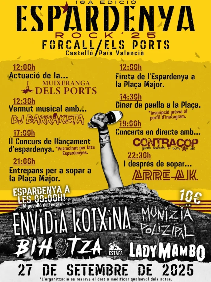 Aquest dissabte es donarà cita a Forcall el festival Espardenya Rock, un esdeveniment únic i especial que apropa aquest gènere a la comarca dels Ports. Enguany, compleix 16 anys de la seua primera edició, 16 anys des que un grup de joves va apostar per la descentralització de la cultura i va crear aquest esdeveniment que, avui dia, és tot un referent entre els festivals de rock. A banda de portar fins a Forcall actuacions musicals amb grups de primera categoria nacional, també combina tota una sèrie d’activitats de germanor que posen en valor les arrels de la comarca.