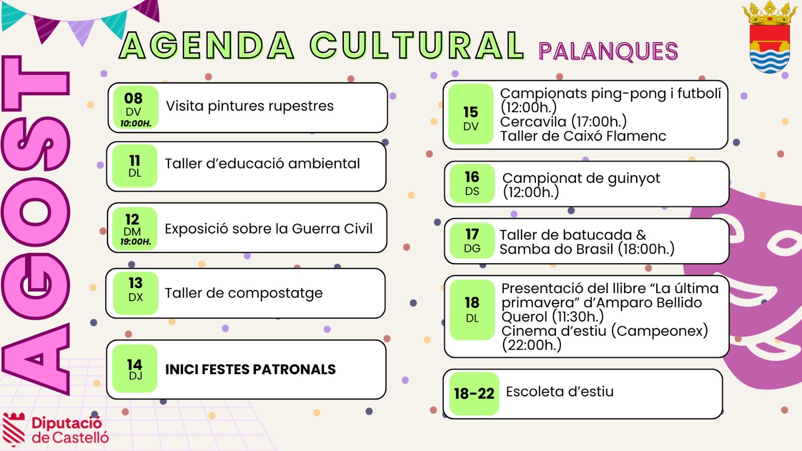 Els actes començaran el 14 de novembre amb un taller de collage a càrrec d’Ame Soler de Tres Voltes Rebel al Casal Jove. El 20 de novembre, l’alumnat del CES Alt Maestrat participarà en els tallers POR-NO!, impartits per Estela Buenaventura de Pupitre Rojo, orientats a sensibilitzar sobre el consum de pornografia i els seus efectes en les relacions i en la reproducció de conductes masclistes.