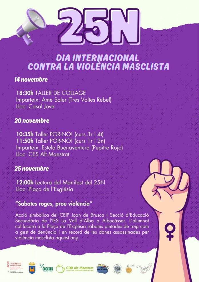 Albocàsser ha preparat un programa d’activitats amb motiu del 25 de Novembre, Dia Internacional per a l’Eliminació de la Violència contra les Dones, fruit del treball conjunt de diverses entitats i centres del municipi. L’objectiu és reforçar el compromís col·lectiu en la lluita contra la violència masclista i fomentar la conscienciació i la implicació de tot el poble.