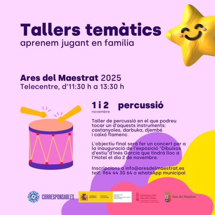 L’Ajuntament d’Ares del Maestrat continua apostant per les activitats familiars i educatives amb els Tallers temàtics: aprenem jugant en família, una iniciativa emmarcada dins del programa Corresponsables, finançat pel Ministeri d’Igualtat a través de la Generalitat. Els tallers es duran a terme els dies 1 i 2 de novembre al Telecentre, dedicats en aquesta ocasió a la percussió.
