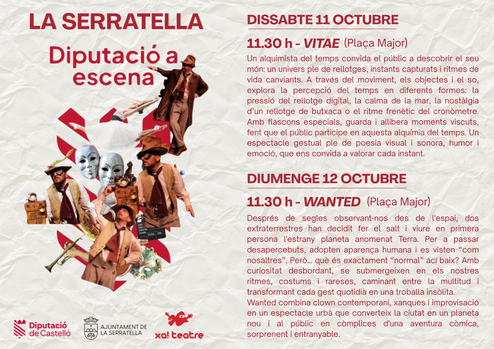 La plaça Major de la Serratella es convertirà el segon cap de setmana d’octubre en escenari de teatre gestual i clown amb dos espectacles de Xa! Teatre: Vitae i Wanted. Les representacions estan incloses en el programa cultural Diputació a escena, impulsat per la Diputació de Castelló, amb la col·laboració de l’Ajuntament de la Serratella.