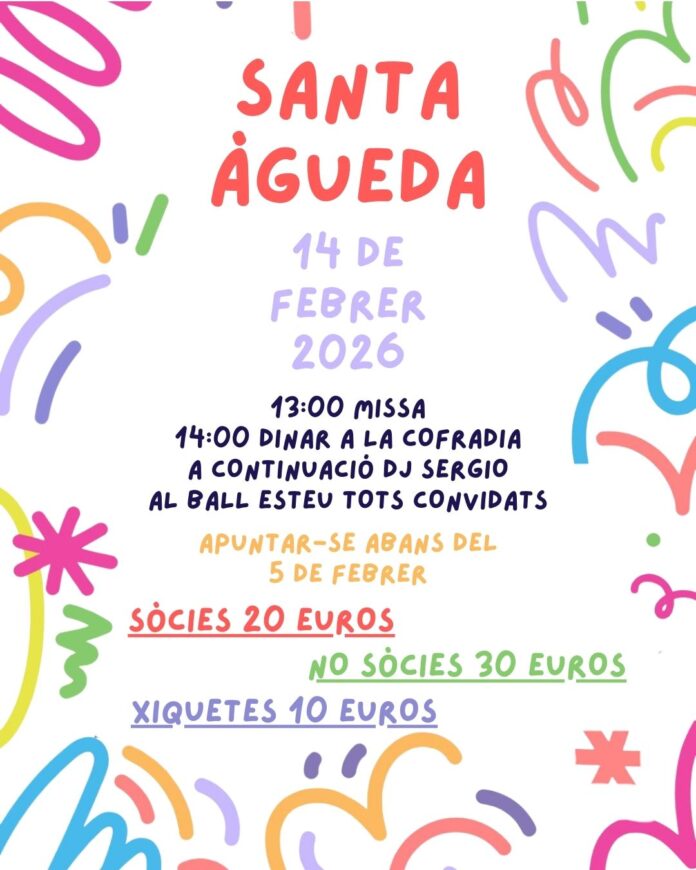 La jornada començarà amb una missa en honor a Santa Àgueda, que donarà pas a un dinar de germanor a la confraria. Després del dinar, la celebració continuarà amb ball amb la música de DJ Sergio. Aquest estarà obert a tot el públic que vulga sumar-se a la festa.