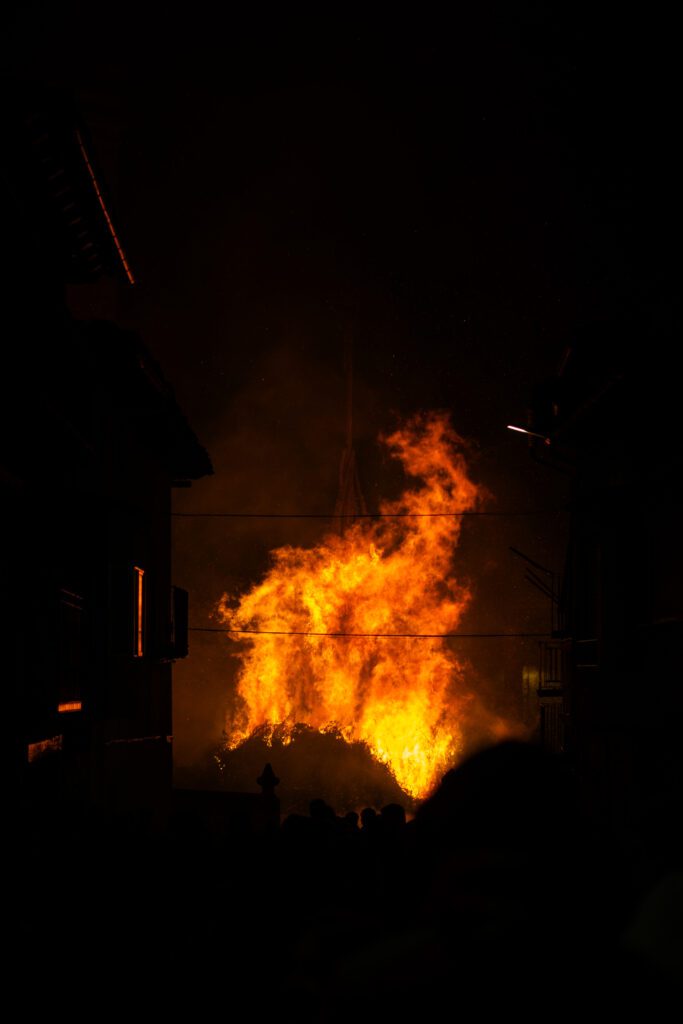 A la vesprada s’han arrossegat els troncs pels carrers del poble amb l’ajuda de les cavalleries guiades de manera convenient pels ‘arrieros’. Tot el poble s’ha reunit en l’històric local de la confraria medieval per a sopar. Després del sopar ha arribat el moment de beneir tots els animals. Després, la majoralia, ha repartit el pastís farcit de confitura de carabassa. Ha sigut el pas previ a l’encesa i crema de la foguera. En la crema de la barraca els bombers s’han hagut d’ocupar a fons davant el fortíssim vent que bufava. La crema de la pira ha generat una gran fumera. Centenars de persones s’han reunit entorn de la plaça de Castellfort per a assistir a la combustió de les branques.