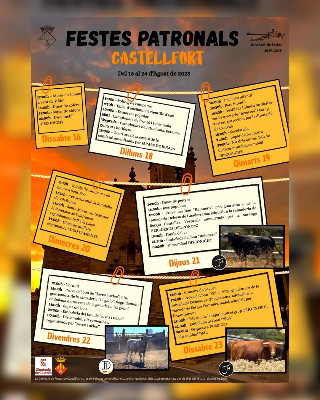 El municipi de Castellfort viurà del 16 al 24 d’agost les seues tradicionals festes patronals, organitzades per la Comissió de Festes 2024/2025 amb la col·laboració de l’Ajuntament. Durant nou dies, la localitat es transformarà en un punt de trobada, convivència i celebració, amb un programa complet i variat que combina actes culturals, religiosos, taurins, gastronòmics i lúdics per a totes les edats.