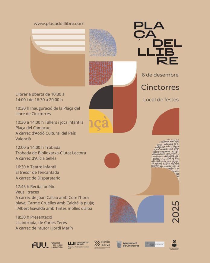 Aquest dissabte 6 de desembre el local de festes de Cinctorres es transformarà en la Plaça del llibre, on la literatura es cobrara el protagonisme del dia. Amb tallers, recitals i presentacions, veïns, veïnes i visitants de Cinctorres podran gaudir d’una jornada entre històries i llibres. Des de les 10 h del matí fins a les 20 h de la vesprada estarà la llibreria oberta per poder adquirir obres de tota classe. A més, s’ha preparat tot un programa amb activitats per a tots els públics.