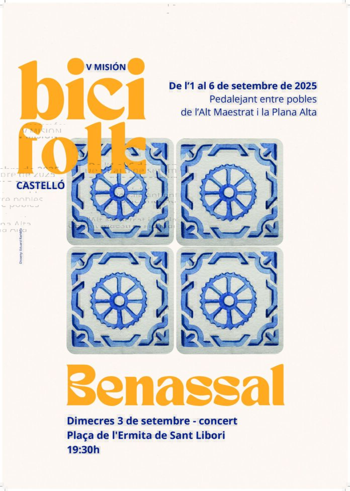 Benassal acollirà el dimecres 3 de setembre una de les etapes de la cinquena edició de Bicifolk, la ruta que combinarà bicicleta i música popular en el seu recorregut per pobles de l’Alt Maestrat i la Plana Alta. L’etapa de Benassal comptarà amb un concert a la plaça de l’Ermita de Sant Libori a les 19.30 hores, en una jornada que convertirà el municipi en punt de trobada entre cultura, música i natura.