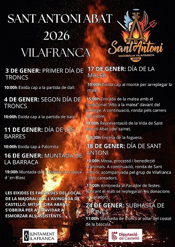 Vilafranca té un dels Sant Antoni més llargs de la província de Castelló. Quatre caps de setmana en què els majorals, amb l’ajuda de col·laboradors, fan possible una festa molt arrelada al territori i que any rere any ompli Vilafranca de foc i tradició.