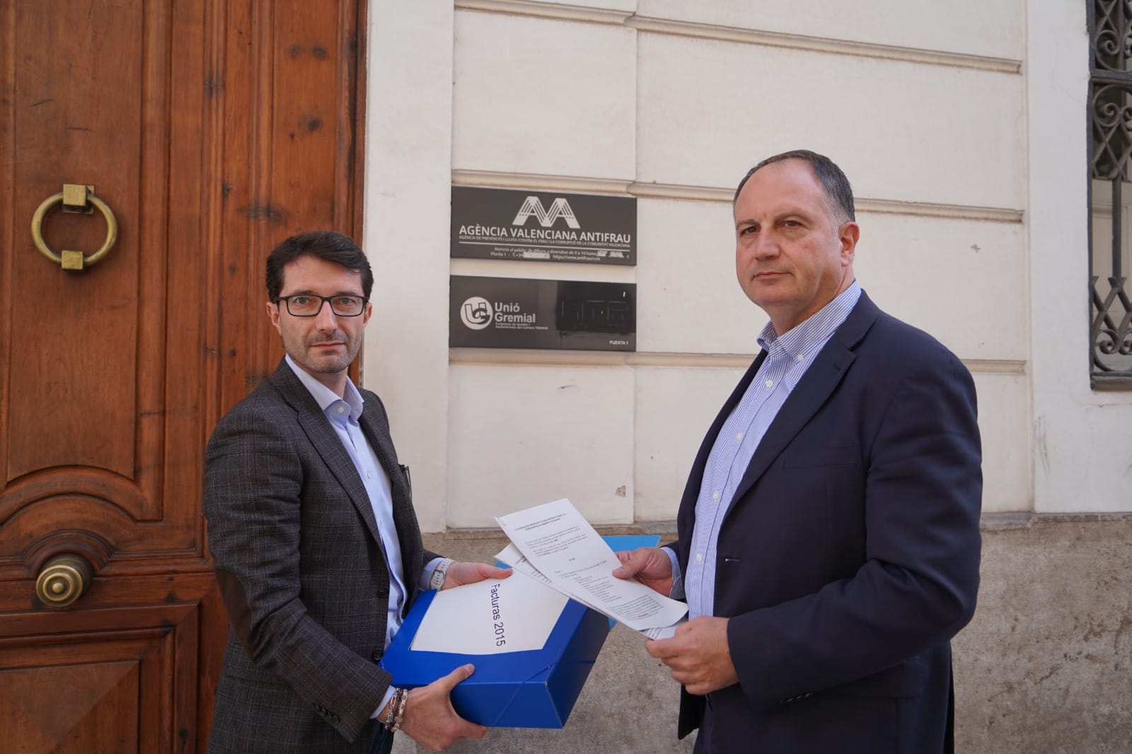El síndic adjunt del GPP, Salvador Aguilella, i el diputat Jesús Lecha han acudit a la seu de l’Agència de Prevenció i Lluita contra el Frau i la Corrupció de la Comunitat Valenciana per lliurar més factures localitzades de l’Ajuntament morellà sense cap contracte previ.
