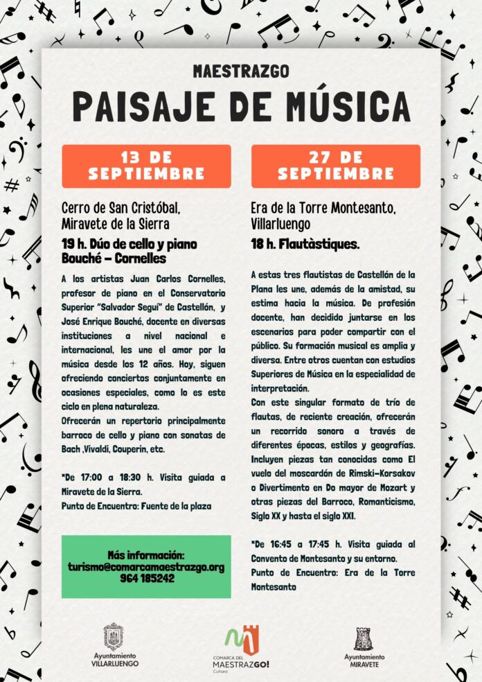 La Comarca del Maestrazgo celebra este mes de septiembre una nueva edición del ciclo ‘Maestrazgo, paisaje de música’, una propuesta cultural que une patrimonio, naturaleza y arte sonoro en enclaves singulares del territorio. Los conciertos tendrán lugar el 13 de septiembre en Miravete de la Sierra y el 27 de septiembre en Villarluengo, ambos acompañados de visitas guiadas para descubrir el entorno.