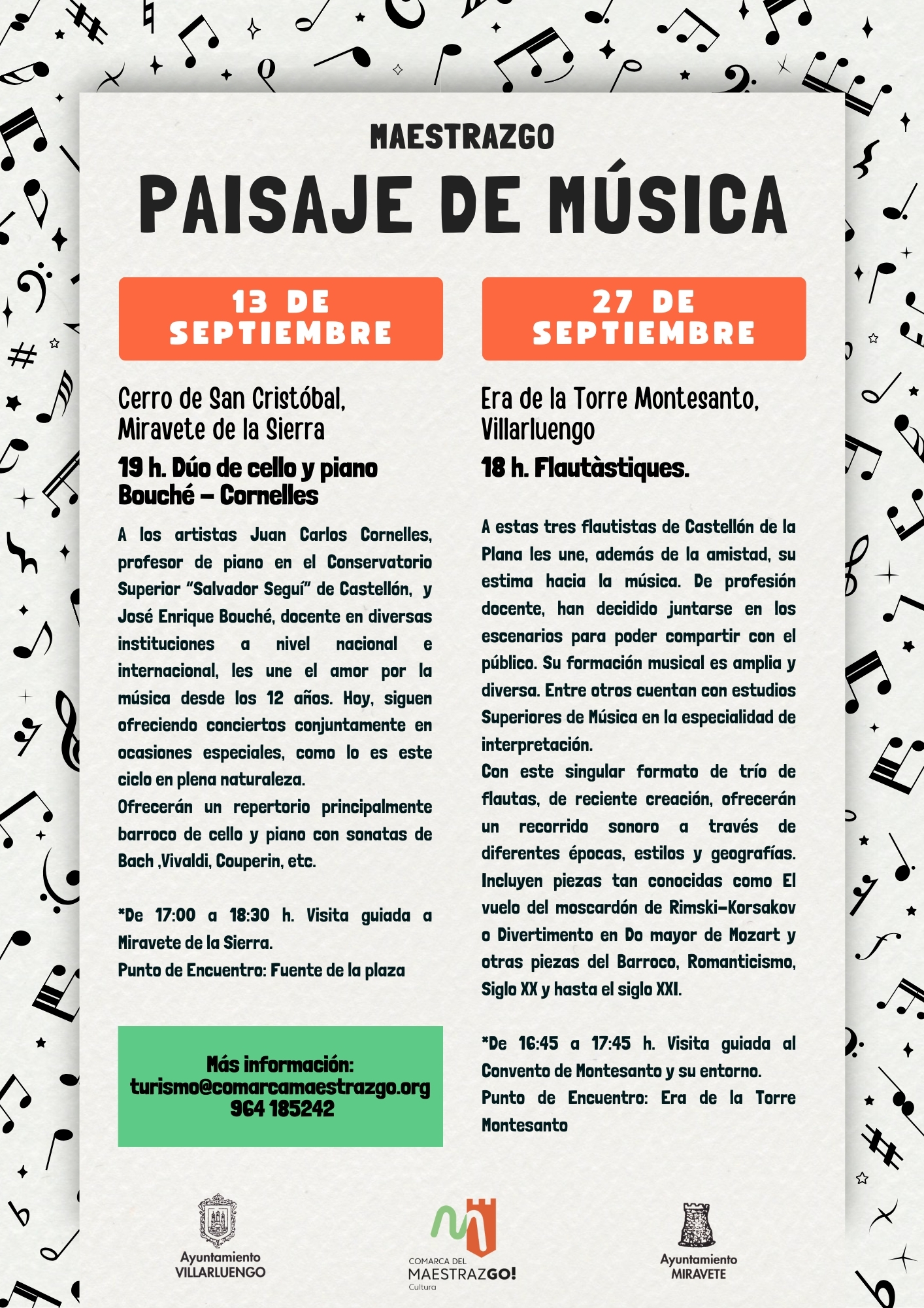 El programa se abrirá el 13 de septiembre a las 19h en el Cerro de San Cristóbal de Miravete de la Sierra, con el concierto del Dúo Bouché–Cornelles. Los artistas Juan Carlos Cornelles (piano) y José Enrique Bouché (cello), con amplia trayectoria docente e interpretativa, ofrecerán un repertorio principalmente barroco con sonatas de Bach, Vivaldi o Couperin. Antes de la actuación se realizará una visita guiada a Miravete de la Sierra.