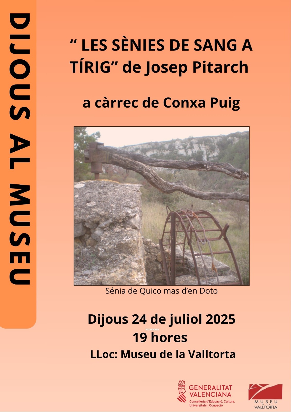 El Museu de la Valltorta acollirà dijous 24 de juliol de 2025, a les 19 hores, una nova sessió del cicle Dijous al museu amb la presentació de la publicació Les sénies de sang a Tírig, de Josep Pitarch, a càrrec de Conxa Puig.