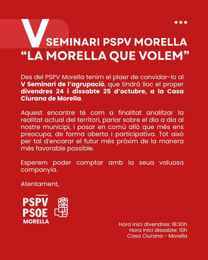 El Partit Socialista de Morella celebrarà aquest divendres 24 i dissabte 25 d’octubre el V Seminari de l’Agrupació Local, baix el títol “La Morella que volem”, una trobada oberta que busca impulsar un projecte de futur per a la ciutat, de cara a 2027, a través del diàleg, la participació i la col·laboració oberta entre la militància socialista i la societat morellana.