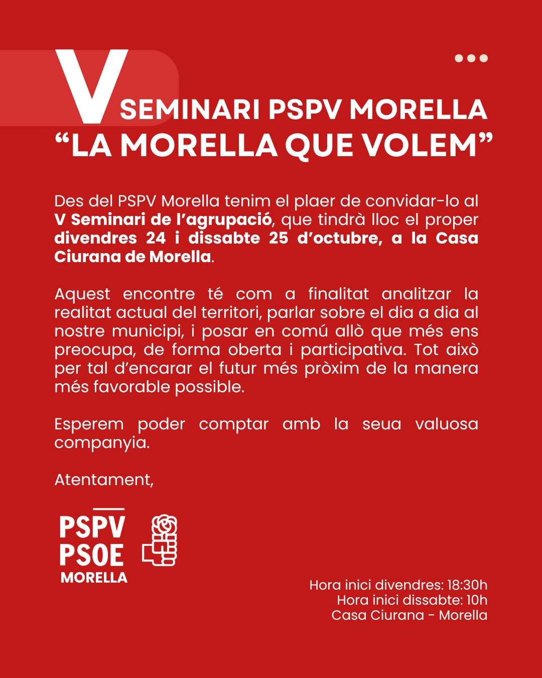 Des del PSPV Morella es convida a totes i tots els veïns i veïnes a participar d’aquestes jornades, que són una crida a recuperar el diàleg, l’orgull de ciutat i l’esperança col·lectiva. ‘’Un primer encontre, de molts altres, per teixir, entre totes i tots, un projecte de futur pel nostre poble”.