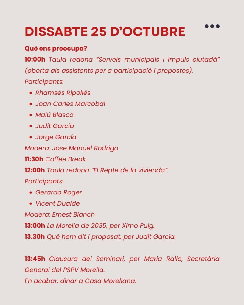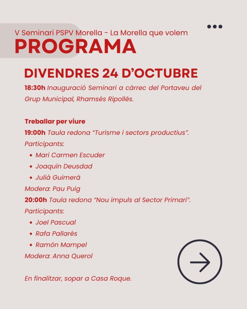 També hi intervindran Rhamsés Ripollés, portaveu del Grup Municipal Socialista; tots els membres del grup municipal socialista, el diputat Ernest Blanch; Ximo Puig, expresident de la Generalitat i referent del socialisme valencià, que oferirà la ponència “La Morella de 2035”; i Maria Rallo, que tancarà el seminari amb la cloenda oficial.