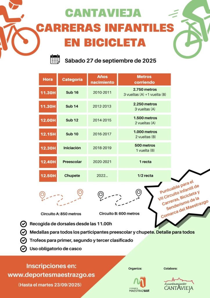 Los más jóvenes también podrán disfrutar del ciclismo el próximo sábado 27 de septiembre de 2025 en Cantavieja con las Carreras Infantiles en Bicicleta. Niños y niñas de distintas edades recorrerán circuitos adaptados, todos ellos puntuables para el VII Circuito Infantil de Carreras, Bicicleta y Senderismo de la Comarca del Maestrazgo