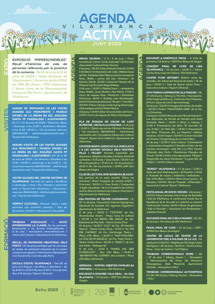 El dilluns 12 l’IES Vilafranca obrirà les seves portes a les famílies amb fills i filles en sisè de primària. El 13 l’alumnat de segon cicle de primària del CEIP Don Blasc d’Alagó anirà d’excursió a Sogorb i Vila-real i el 15 farà el propi però a Dinópolis l’alumnat de primer cicle. El dia 16 l’IES oferirà el concert de fi de curs i arribarà el festival de funky Cosmic Funk Odyssey. Del 16 al 18 de juny se celebrarà la XXVI Marxa Homenatge als Maqui. El 17 hi haurà Bureo i el 18 serà la Festa Anual de Socis i Sòcies de l’Associació de Pensionistes i Jubilats Francolí.