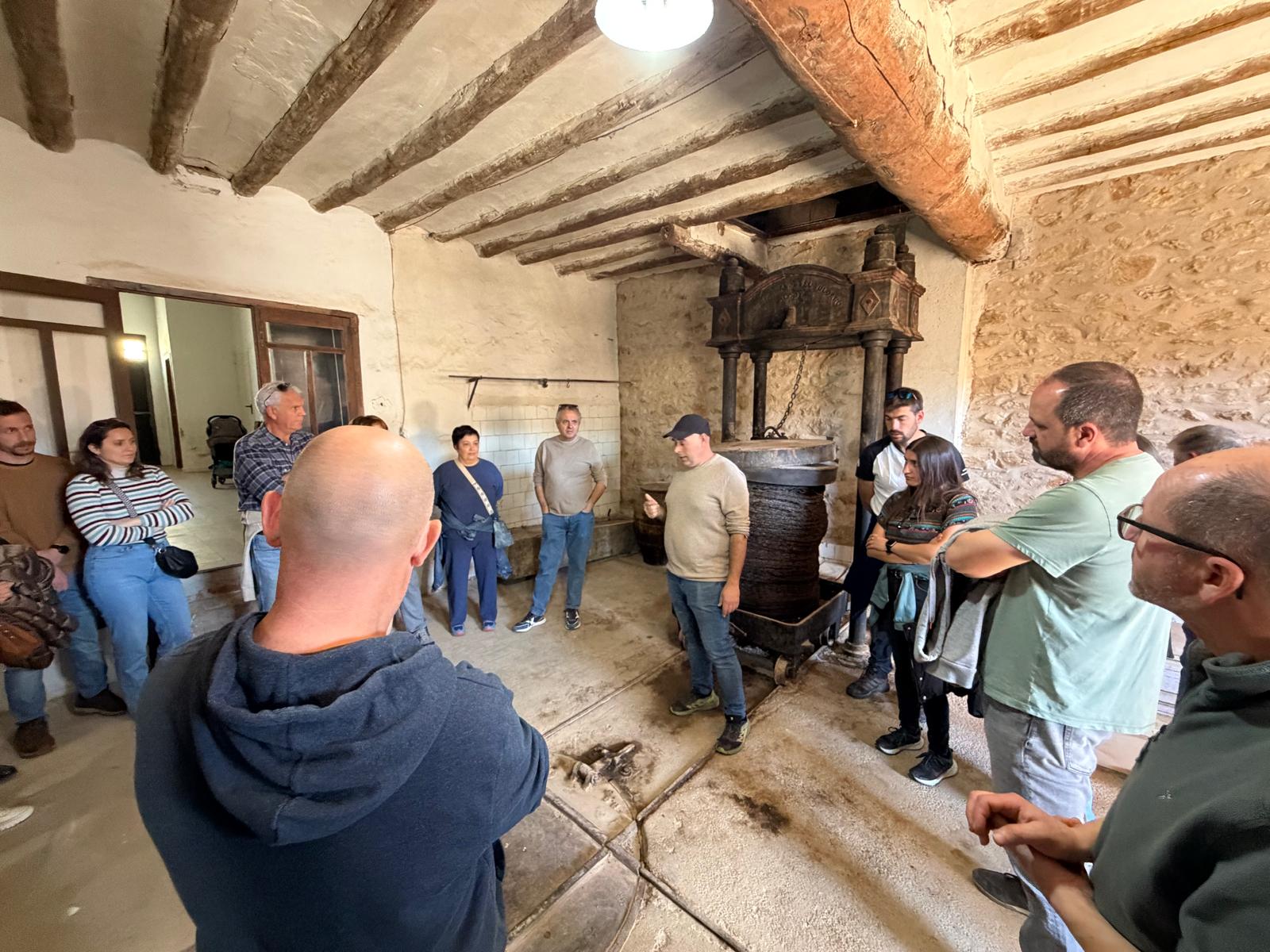 Després de l’eixida, el grup es va traslladar al molí antic d’Olis Fogà, on es va mostrar com funcionava una instal·lació d’elaboració d’oli als anys cinquanta. “Vam veure un molí que estava funcionant al 56. Ja hi havia electricitat, però el curiós és que el sistema de batut era amb rodes de pedra i l’extracció, per premses”, resumeix Tena. En este mateix espai també es va explicar com es van empeltar i tornar a plantar moltes oliveres després de la gelada.