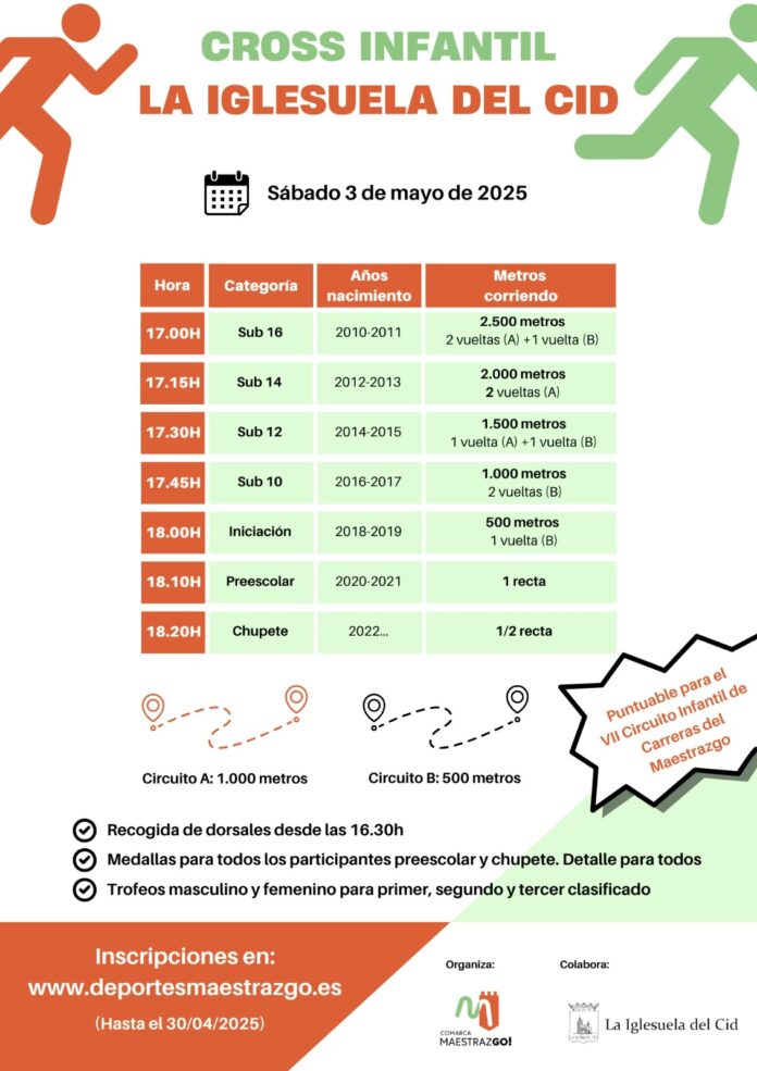 Previamente a la carrera, el Ayuntamiento de La Iglesuela del Cid y la Comarca Maestrazgo han convocado también este sábado un Cross infantil, puntuable para el VI Circuito infantil de carreras del Maestrazgo. Con circuitos adaptados a las siete edades y categorías de la prueba –desde los tres años hasta Sub16-, los jóvenes corredores recorrerán desde unos pocos pasos (media recta) de la categoría chupete hasta los 2.500 metros para los participantes de 15 años. Los tres más rápidos de cada categoría recibirán trofeo y habrá medalla para todos los corredores de preescolar y chupete. Cabe indicar que las inscripciones estarán abiertas hasta el 30 de abril en www.deportesmaestrazgo.es.