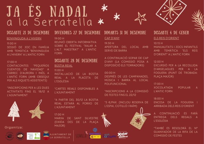 L’Ajuntament de La Serratella, amb diverses associacions i entitats locals, ha preparat una completa programació nadalenca que arrancarà dissabte que ve, 21 de desembre, i es prolongarà fins al 4 de gener. Dos setmanes en les quals el municipi s’impregnarà de l’autèntic esperit nadalenc amb activitats per a totes les edats que junten oci, cultura, esport i tradició.
