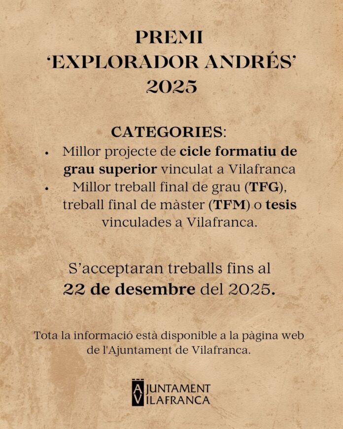 L’Ajuntament de Vilafranca ha obert la convocatòria del Premi ‘Explorador Andrés’ 2025, un guardó destinat a reconéixer els millors treballs acadèmics relacionats amb la localitat.