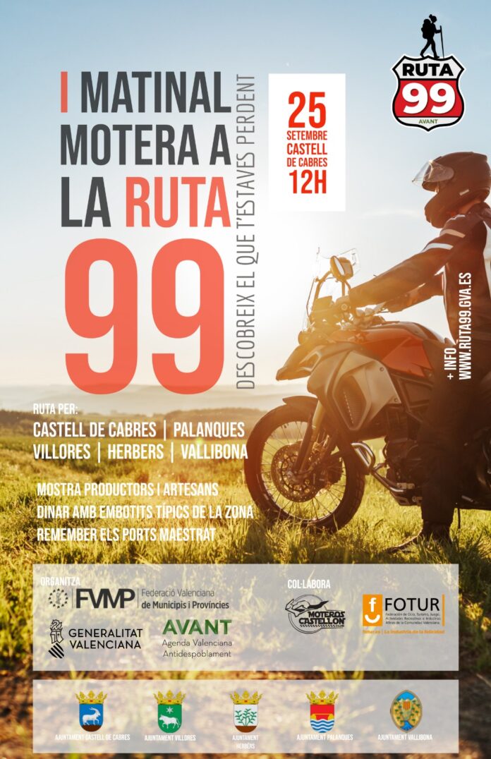 La comarca dels Ports serà recorreguda en moto el proper diumenge 25 de setembre. Es tracta de la I Matinal Motera organitzada per recórrer les localitats que formen part de la Ruta 99, una invenció de la Generalitat Valenciana creada per donar a conéixer els 24 pobles amb menys habitants del País Valencià i fomentar el turisme. Així doncs, Castell de Cabres, com a poble amb menys habitants registrats de la Ruta, és l’inici d’aquest viatge que també creuarà per Palanques, Villores, Herbers i Vallibona.