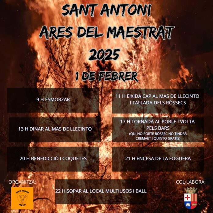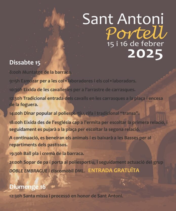 Després d’un dinar de germanor al local polifuncional, a les 17:30 es va procedir a la benedicció dels animals i les coquetes, un dels moments més esperats. La jornada va culminar amb l’encesa de la foguera a les 19:00, un espectacle que va il·luminar la nit mentre els assistents gaudien del repartiment de les tradicionals coquetes. La festa es va prolongar fins ben entrada la nit amb el sopar de pa i porta al local polifuncional, amenitzat amb música i ball. El diumenge va començar amb una missa solemne i la posterior processó en honor a Sant Antoni. A les 12:00 es van celebrar les tradicionals “Corregudes del pollastre”, un dels esdeveniments més esperats per grans i menuts. Les celebracions van concloure amb un altre dinar organitzat pels Majorals 2025 al local polifuncional, tancant un cap de setmana d’èxit i bona convivència.
