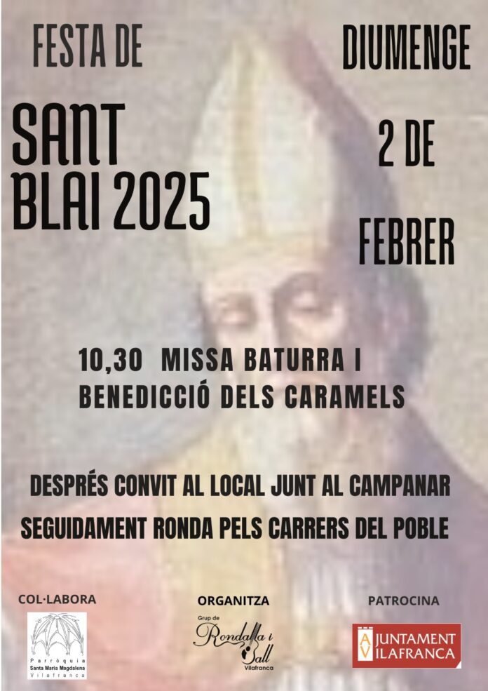 El 2 de febrer es rendirà devoció a Sant Blai amb una missa baturra, la benedicció dels caramels, un convit i una ronda.