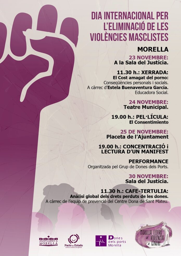 A banda, al llarg de tota la setmana també hi haurà una programació d’activitats emmarcades dins el Dia Internacional per l’erradicació de la violència de gènere. Aquesta vesprada es farà la xerrada ‘Estereotips i rols de gènere’, a càrrec del Centre Dona de Sant Mateu. El divendres 29, Amparo Bellido Querol presentarà el seu llibre ‘La última primavera’. Finalment, el dissabte 30 la Casa de la Cultura acollirà l’obra ‘Nimbes’, de la Cia. Fil d’Arena.