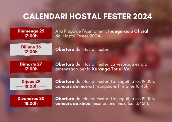 Amb el pregó i la inauguració de la tasca, s’han encetat les festes. Seguidament, es durà a terme un dinar popular seguit de ‘tardeo’ amb la xaranga Els Indultats i es farà el II Concurs de llançament de pinyol a la plaça de l’Ajuntament. El dia es tancarà amb la nit a la tasca.