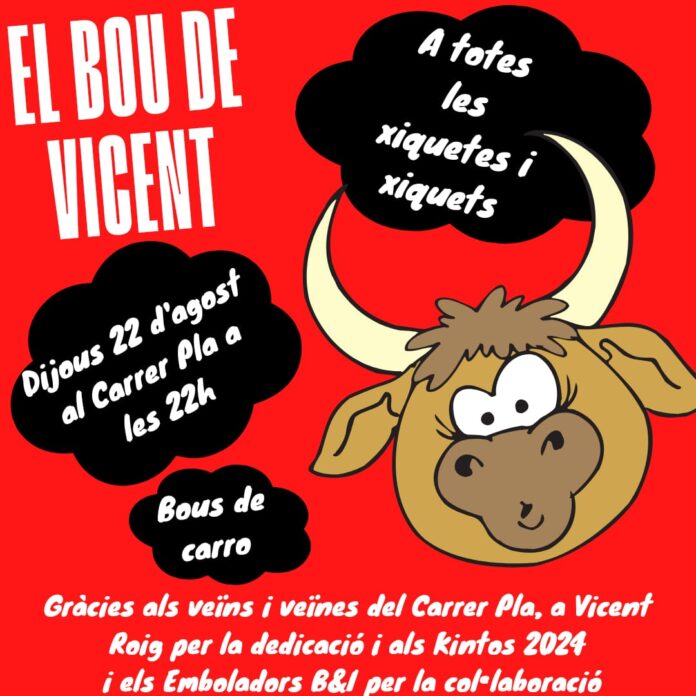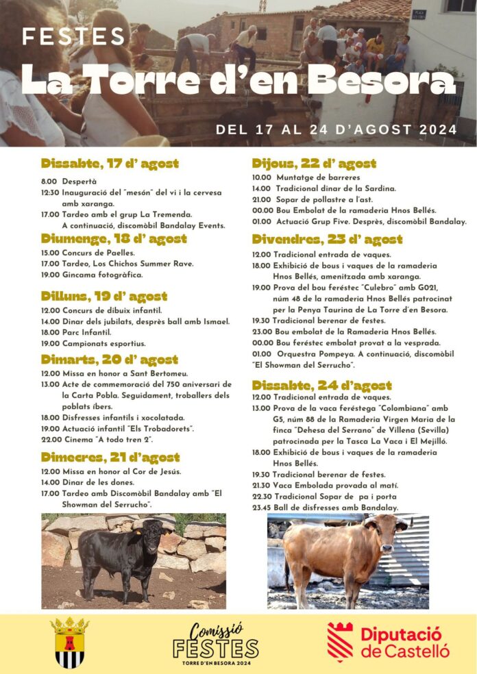 La festa arribarà al seu final el dia 24 d’agost amb la tradicional entrada de vaques, proves de vaques feréstegues, exhibicions de bous i vaques, berenar, sopar, embolada d’una vaca i el ball de disfresses.