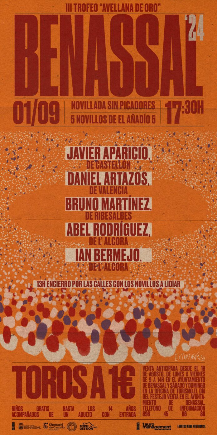 La jornada dominical tindrà la lectura de la Crida de festes, a càrrec de Mari Luz Monterde Puig, com a acte central del matí, seguit de l’hissat, al campanar, de la bandera de Benassal pels Quintos 2024 i la interpretació de l’himne de la localitat. La música tornarà a ser protagonista de vesprada amb el XXXI Concert-homenatge de la banda de música Font d’En Segures al compositor Perfecto Artola. També estarà present en la sessió de vesprada per als més menuts i a la VII Festa remember nocturna de la penya El Pepinillo. Completaran la jornada els actes taurins, amb ramat d’El Gallo.