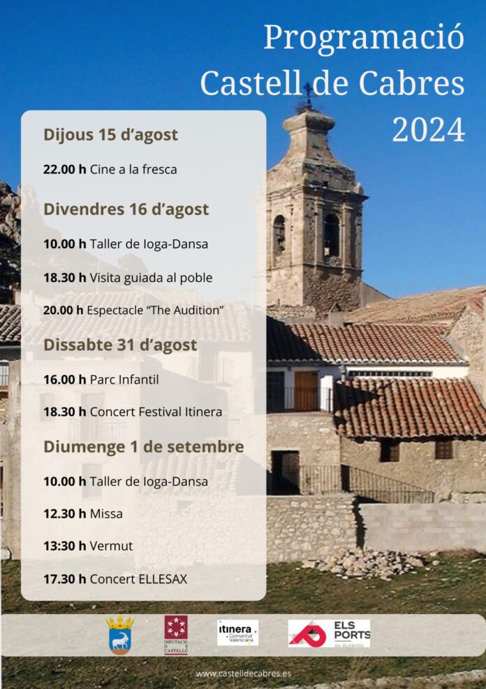 Durant la setmana prèvia a les Festes també es succeiran actes culturals com la presentació dels llibres ‘No me llames princesa’, ‘Doña Gloria’, ‘Don Quijote en Castelló’ o ‘Un regal per a Alexandra’; o l’espectacle de circ i màgia ‘Oniricus’. El Dia de les Dones, festejat el dijous 22 d’agost, acabarà amb la programació cultural preparada per a rebre les Festes Patronals i celebrar-les acompanyats de familiars, amistats i veïnat del poble en una setmana de germanor.