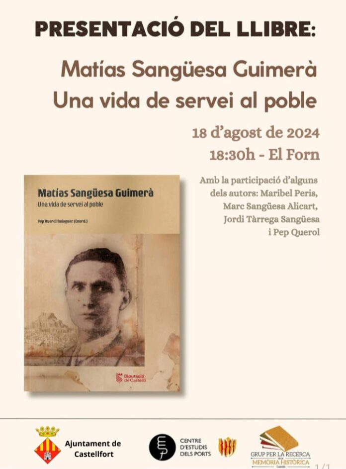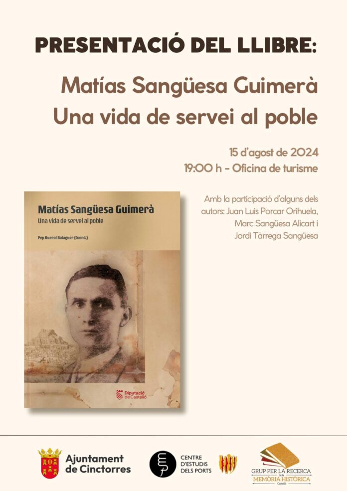 AVUI, dijous, 15 d’agost, a les 19 h, a l’Oficina de Turisme de CINCTORRES, presentació del llibre Matías Sangüesa Guimerà. Una vida al servei del poble