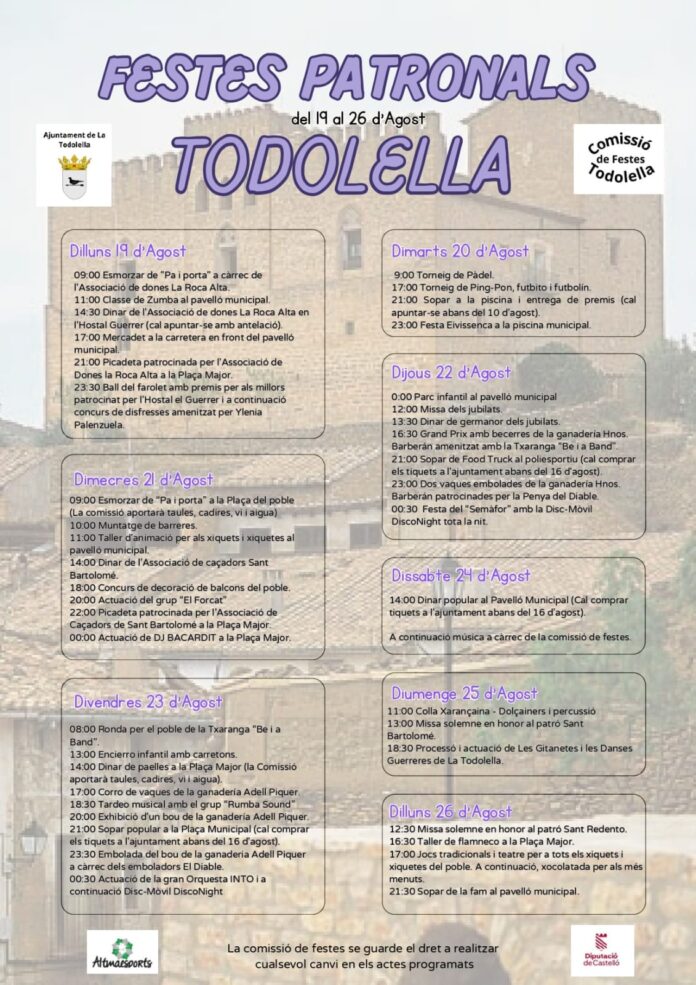 Estes setmanes es viuen amb intensitat a Vistabella del Maestrat. Amb una agenda carregada d’actes i activitats fins a finals d’agost, el municipi de l’Alt Maestrat gaudix de jornades culturals i dies festius fins a arribar a les Festes Patronals, la setmana gran de l’any que enguany començarà el divendres 23 i acabarà el dissabte 31.