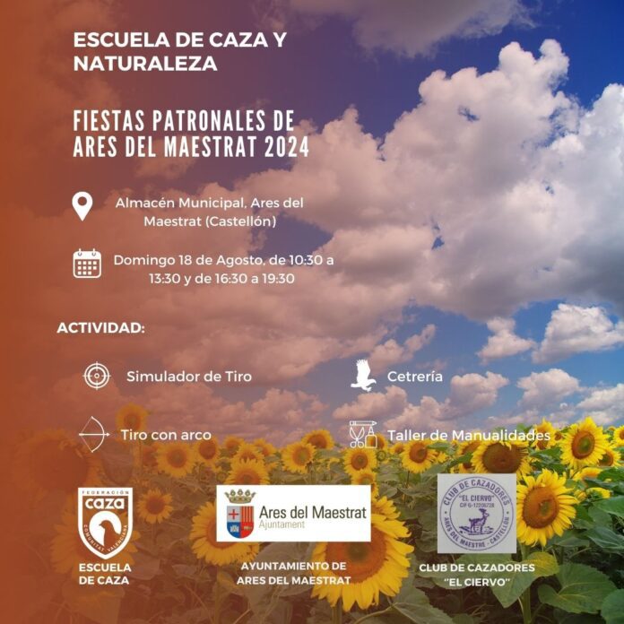 El diumenge serà el torn d’Urban Sketchers Castelló, que dibuixaran els racons més màgics d’Ares. Al migdia es farà una vermutada. I a la vesprada es durà a terme l’escola de caça i natura. Després, es farà la primera subhasta d’Ares. La nit serà protagonitzada per un sopar de pa i porta, un concurs de pasdobles i per la nit tropical a la tasca.