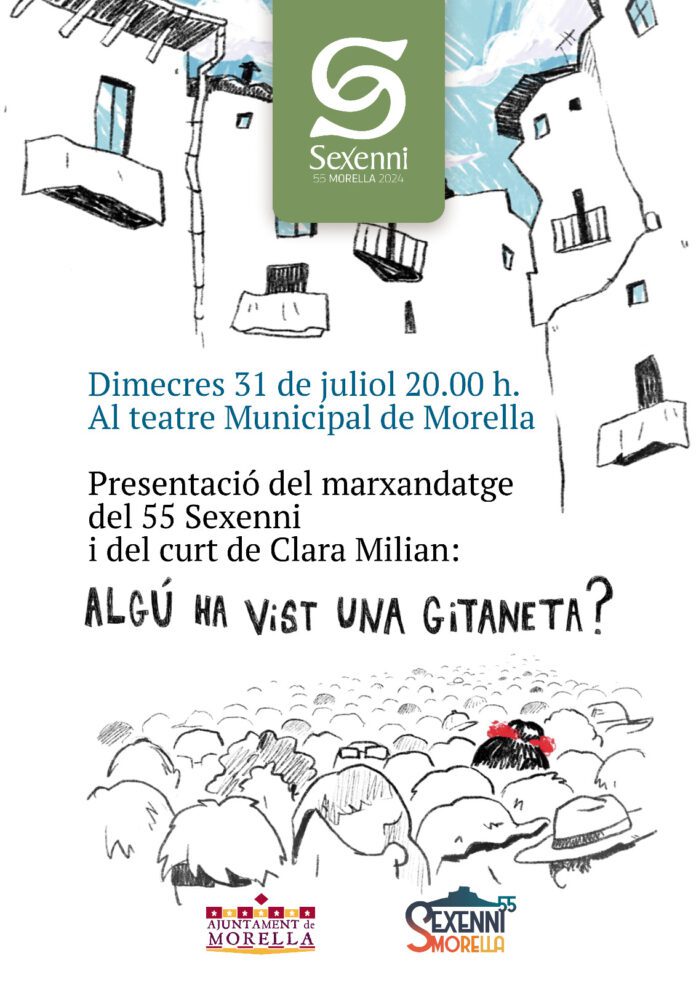 Dimecres 31 de juliol a les 20.00h. al Teatre Municipal presentació del curt Algú ha vist una gitaneta? de Clara Milian, i presentació del marxandatge i records del 55 Sexenni.