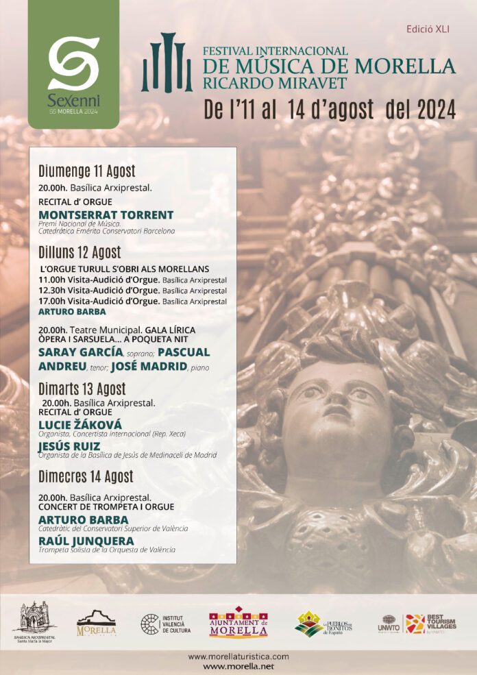 El Festival Internacional de Música de Morella Ricardo Miravet, degà dels festivals morellans, arriba aquest estiu a la seva 41a edició amb una proposta variada que centrarà les seves activitats a l’òrgan històric Turull de la Basílica Arxiprestal de Morella. Les activitats del festival es desenvoluparan entre els dies 11 i 14 del proper mes d’agost.