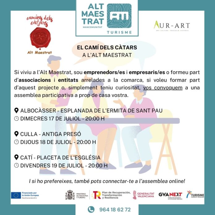 La Mancomunitat de l’Alt Maestrat ha programat esta setmana tres assamblees participatives als municipis d’Albocàsser, Culla i Catí per a explicar el projecte ‘El camí dels càtars a l’Alt Maestrat’. En concret, la plataforma ha convidat a emprenedors, empresaris, entitats i associacions arrelades a la comarca per tal de detallar en què consistirà aquesta iniciativa.