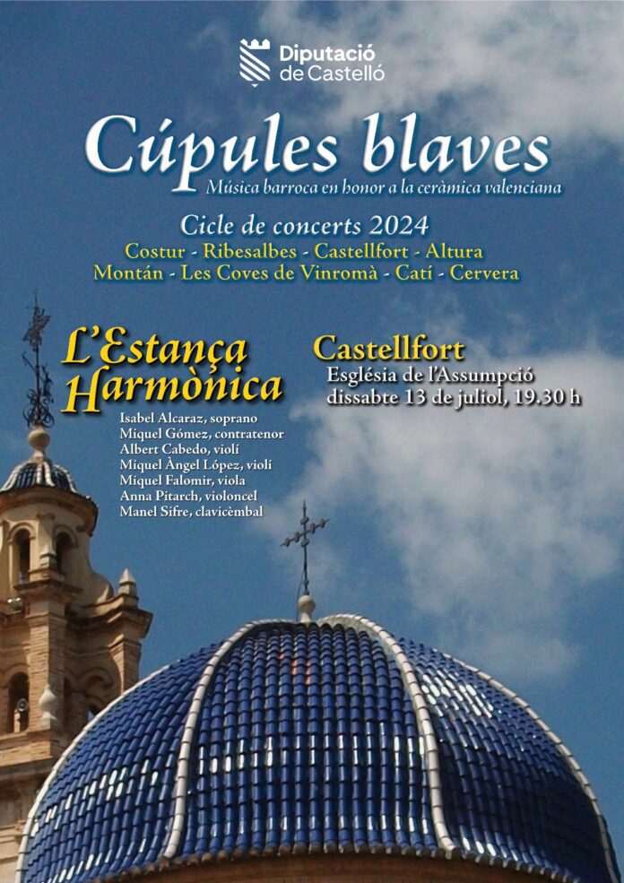 Castellfort ha acollit aquest dissabte el cicle de concerts Cúpules blaves que organitza la Diputació de Castelló. Es tracta d’actuacions de música barroca en honor a la ceràmica valenciana que, en aquest cas, ha permès escoltar les peces interpretades per l’Estança Harmònica. L’església de l’Assumpció ha estat l’escenari del concert a càrrec de la soprano Isabel Alcaraz i el contratenor Miquel Gómez, acompanyats per Albert Cabedo (violí), Miquel Àngel López (violí), Miquel Falomir (viola), Anna Pitarch (violoncel) i Manel Sifre (clavicèmbal).