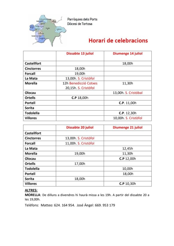 Els actes religiosos també tenen cabuda en aquesta agenda. El dia 14 es realitzarà la Missa de la Mare de Déu del Carme. Aquest mateix dia, a la vesprada, l’Acadèmia d’Orfeu oferirà un Rèquiem de Fauré. El diumenge 21 se celebrarà la Missa de Santa Maria Magdalena.