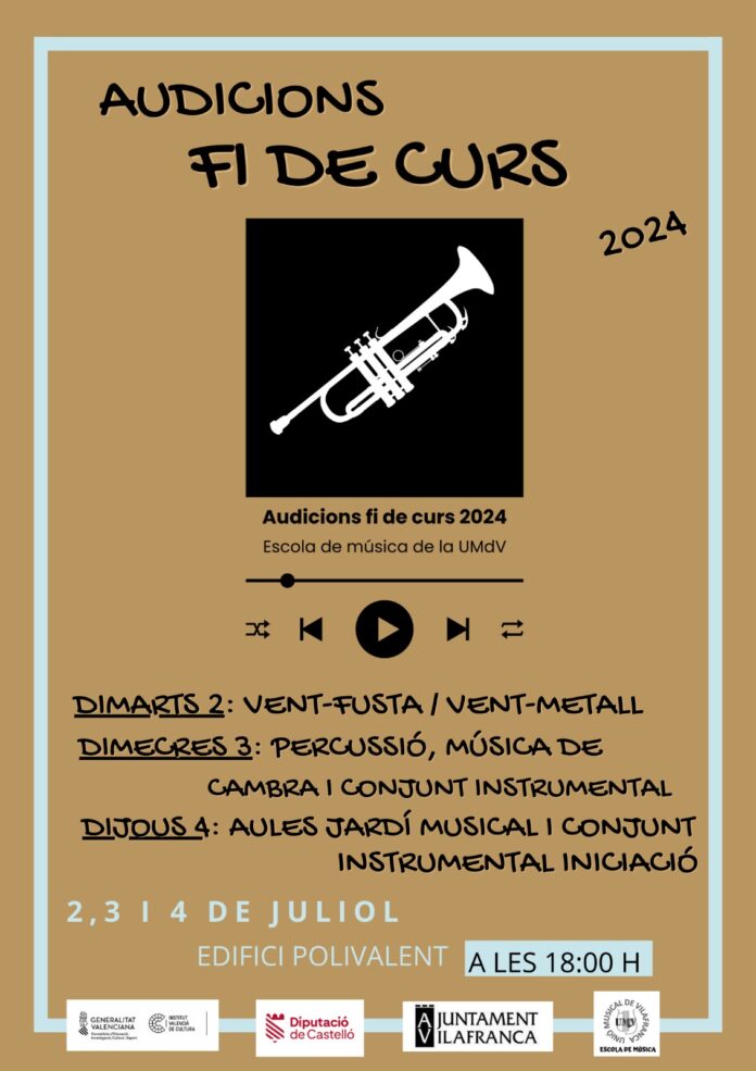 Els dies 2, 3 i 4 de juliol, l’alumnat de l’Escola de Música demostrarà tot l’aprés durant aquest curs amb les audicions de fi de curs. A més, la música també omplirà Vilafranca el dia 11 amb el concert de ‘Gran músico mejor persona’, el dia 13, amb un concert de Blue Star, el dijous 25 amb Pablito the kid, i el dimecres 31 amb l’Escola de pols i pua.