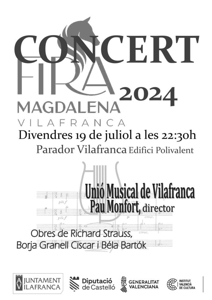El cap de setmana començarà la nit del divendres 19 de juliol a les 22.30 h al Parador amb el clàssic concert Extraordinari Fira de la Magdalena de la Unió Musical de Vilafranca. Sota la direcció de Pau Monfort, la banda interpretarà obres de Richard Strauss, Borja Granell Ciscar i Béla Bartók.