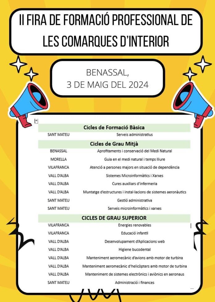 Així, al centre de Benassal se li ha sumat l’institut de Vilafranca, Sant Mateu, Vall d’Alba i Morella, amb parades al carrer per tal d’informar, assessorar i esclarir tots els dubtes a les persones visitants. A més, les instal·lacions del centre també han acollit xarrades divulgatives sobre els trets característics de cada mòdul de Formació Professional.