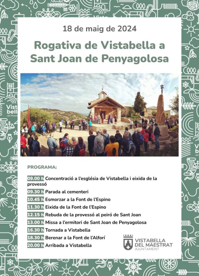 Així, a les 9.00 hores està prevista la concentració a l’església de Vistabella i l’eixida de la provessó, que mitja hora més tard pararà en el cementeri per a continuar fins a la Font de l’Espino, on està previst l’esmorzar. Una vegada que els participants hagen recuperat forces, la rogativa continuarà amb la recepció al peiró de Sant Joan.