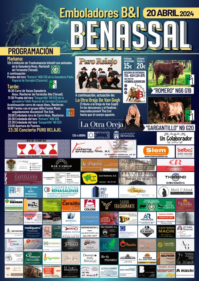 La jornada taurina començarà amb una exhibició de Transhumància infantil amb animals de la Ramaderia Hnos. Martorell, de Fortanete. Seguidament, es farà la prova del bou ‘Romero’, de la ramaderia Pablo Mayoral de Serrejón, de Càceres. A la vesprada tindrà lloc un ‘corro’ de vaques dels Hnos. Monferrer, de Forniche Alt. A més, es tornarà a provar un altre bou, ‘Gargantillo’, de la mateixa ramaderia que la prova del matí. A les 18 h es podrà ballar amb el tardeo del grup Idilio Fusión Music, seguit de l’actuació de la discomòbil The End. A la nit s’embolaran tres bous. Primer, el bou del ‘corro’ de la vesprada, i seguidament, els dos bous provats durant el dia. Així doncs, Benassal acollirà, després, l’actuació de Puro Relajo. Aquest concert anirà seguit de la música de La Otra Oreja de Van Gogh, un tribut que tancarà, al costat de la macrodiscomòbil The End, tota una jornada taurina i de festa.