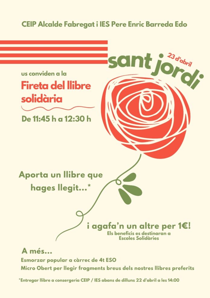 Des del CEIP Alcalde Fabregat i l’IES Pere Enric Barreda Edo ens complau comunicar-vos que esteu convidats al Sant Jordi Solidari que se celebrarà el dimarts vinent, dia 23 d’abril de 2024 entre les 11:45 i les 12:30 a les instal·lacions del centre, on muntarem una fireta del llibre solidària.