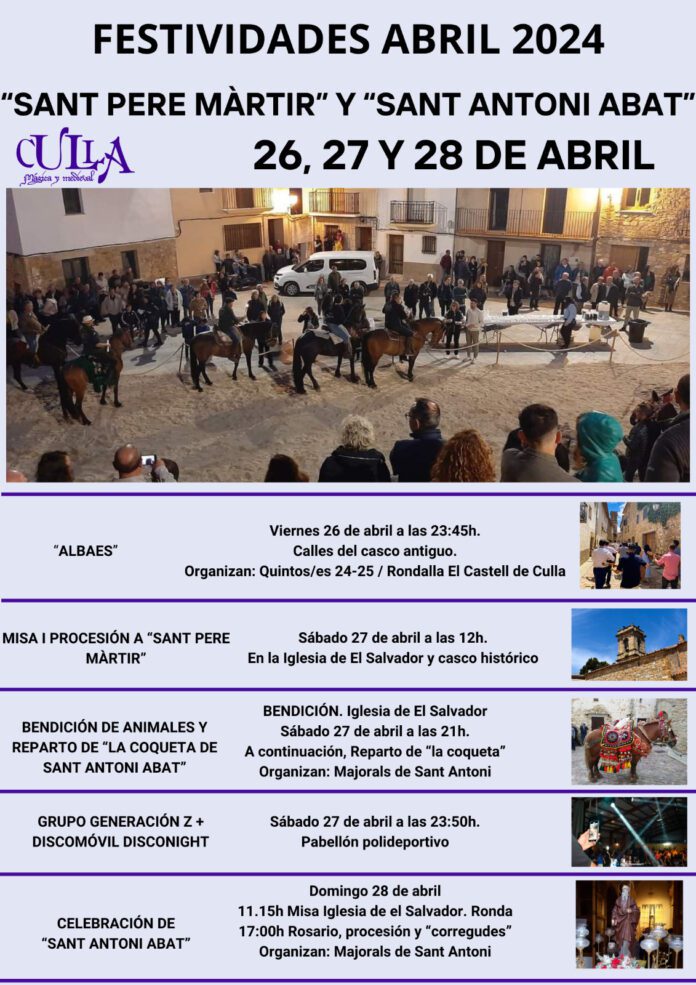 L’esgésia de Culla va acollir aquest dissabte la benedicció d’animals amb motiu de Sant Antoni. A continuació va tindre lloc el repartament de la ‘coqueta’ a la plaça de la de Setena i discoteca mòbil durant la matinada del dissabte al diumenge. Ja en la jornada de diumenge, Culla va tancar les celebracions en honor de Sant Antoni Abat amb missa a l’església del Salvador i ronda de matí i, a partir de les 17 hores, rosari, processó i corregudes baix l’organització dels majorals de Sant Antoni.
