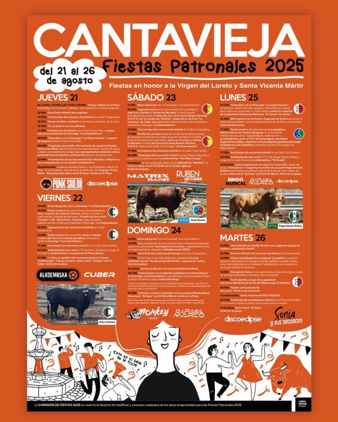 Cantavieja se prepara para vivir sus esperadas fiestas patronales 2025, que se celebrarán del 21 al 26 de agosto en honor a la Virgen del Loreto y Santa Vicenta Mártir. La programación, organizada por la Comisión de Fiestas, incluye una amplia variedad de actos pensados para todos los públicos, en los que destacan los encierros, verbenas, actividades infantiles, concursos y espectáculos musicales.
