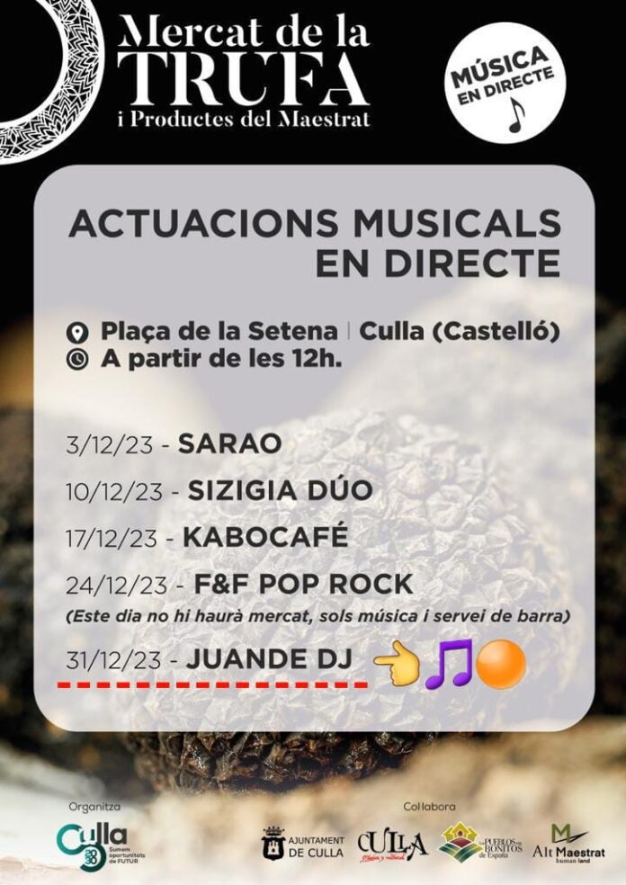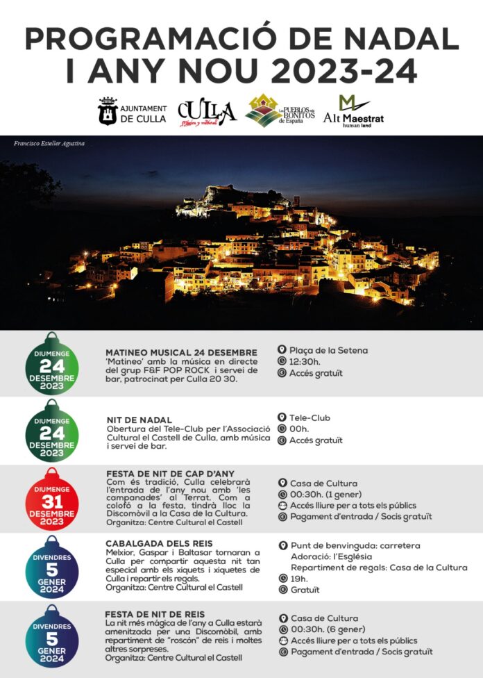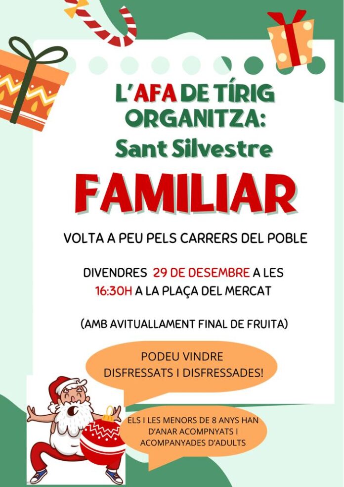 Finalment, l’últim dia de l’any començarà amb la típica cursa Sant Silvestre, que tindrà lloc a les 17 h a la Plaça d’En Blasc com a punt de partida. Ací, els i les més esportistes tancaran l’any donant una volta pel terme de Vilafranca. Seguidament, a les 18.30 h començarà un ‘tardeo’. I per acabar, es faran les 12 campanades de la nit de Cap d’Any al campanar, que aniran seguides per l’actuació de l’orquestra ‘Código’ i de la discomòbil ‘Disconight’ al Parador.