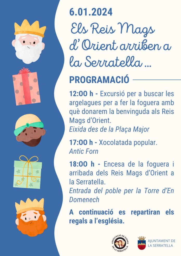 L’Ajuntament i l’Associació de Dones de La Serratella han preparat una completa agenda d’activitats amb motiu de l’arribada de les seues majestats els Reis Mags d’Orient el pròxim 6 de gener de 2024. Així, a les 12h hi haurà una excursió per a buscar les argelagues per a fer la foguera amb la qual es donarà la benvinguda als Reis Mags. Ja a la vesprada, a les 17h, s’oferirà una xocolatada popular en l’Antic Forn. El plat fort del dia arribarà a les 18h quan s’encenga la foguera i les seues majestats d’Orient arriben a La Serratella. La jornada acabarà amb el repartiment de regals a l’Església.